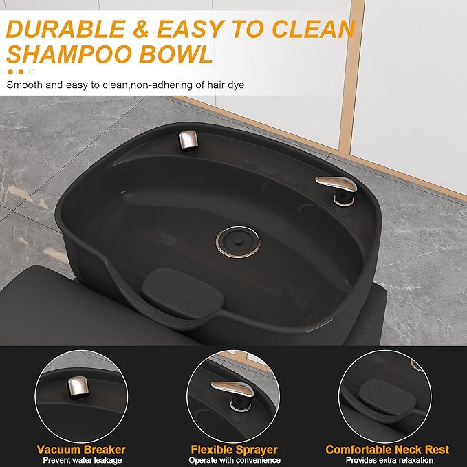 - 【Reasonable Material】:ABS Shampoo Bowl,High-elastic sponge ,Enhanced PU leather, chrome-plated nozzle and Stainless Steels. The shampoo bed is waterproof and rust-proof, durable.This sturdy and practical device is perfect for high-traffic salons.It combines functionality with a sleek black design to enhance any spa or barber shop.