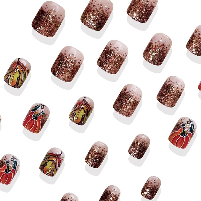 - Autumn Maple Design:Adorned with fall leaves and golden glitter. This autumn artificial nail art set features a short square design and can be matched with almost any outfit, fully demonstrating a fashionable style