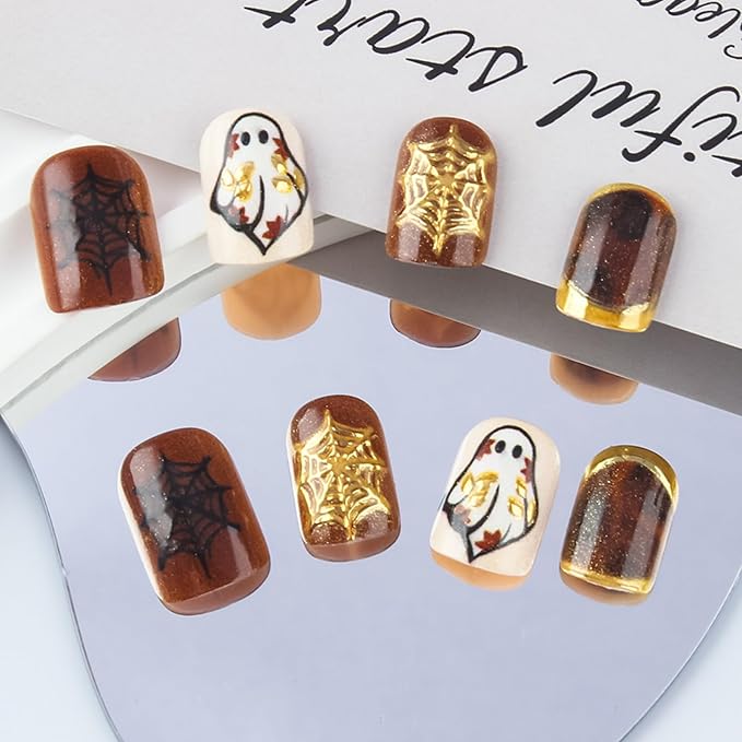 Halloween Press on Nails 3D Gold Spider Web Fake Nails Short Square False Nail with Cute Ghost Designs Brown Glossy Acrylic Nail Fall Glue on Nails for Women Holiday DIY Manicure Kit