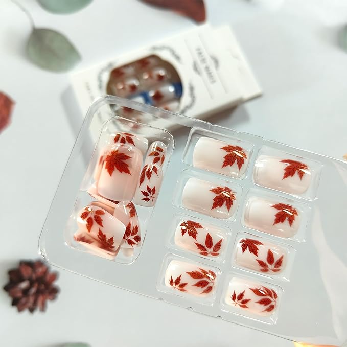 - Complete Package:This set includes 24 pieces of beautifully designed maple leaf press on nails, along with 1 nail file, 24 jelly adhesives, and a handy wooden removal stick to ensure you have a seamless manicure experience
