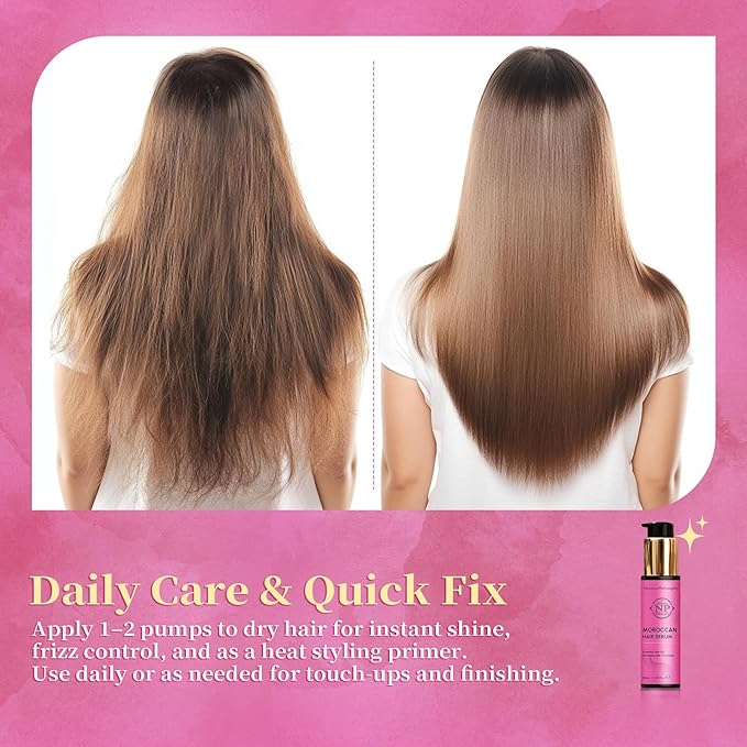 - Anti-Frizz Shine Boost for All Hair Types: Lightweight and non-greasy, this Argan oil serum tames frizz, adds intense shine, and protects against heat styling and humidity—perfect for straight, wavy, or curly hair.