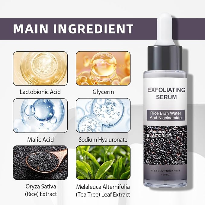- 【Exfoliating & Moisturizing】Powered by rice extract, rich in natural moisturizing factors, this serum helps balance, soothe, and hydrate skin, leaving it visibly refreshed, clear, and radiant.