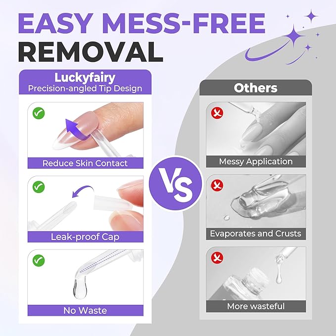 - 【Precision Tip Design-No Extra Tools Needed】Stop wasting product with messy brushes! Our innovative angle-tip design gives you the accuracy to apply press on nail glue remover only where it's needed, preventing too much liquid from touching your skin. Get into the tightest gaps under press-on nails and gently lift nail tips without damaging your natural nails