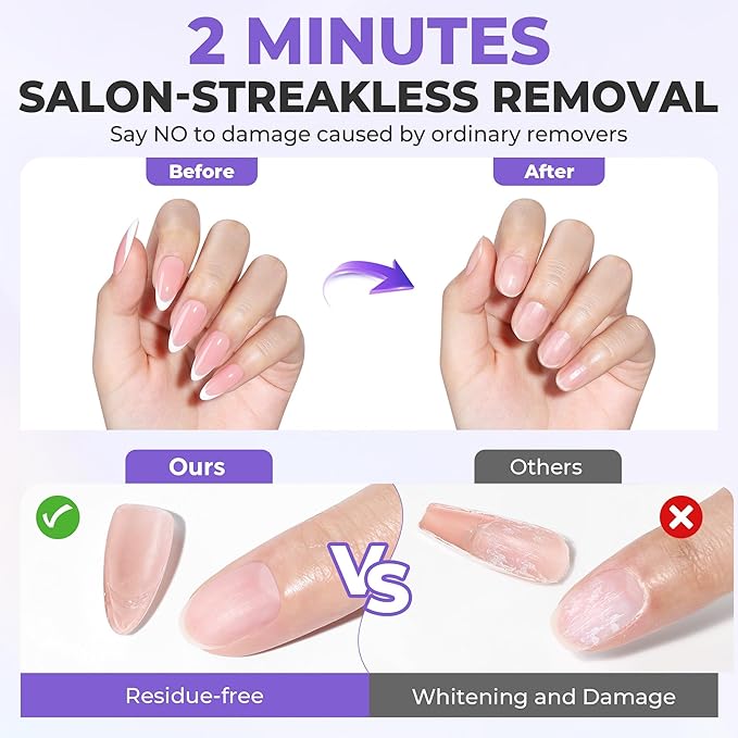- 【Quick Removal-Save Time】Tired of messy, complicated removals? Our advanced nail remover formula works in just 2 minutes to dissolve even the glue without scrubbing or scraping. Enjoy a flawless, salon-streakless finish from the comfort of your home—no residue, no sticky, no hassle. More cost-effective than using a nail drill and saves time and effort compared to using a nail file