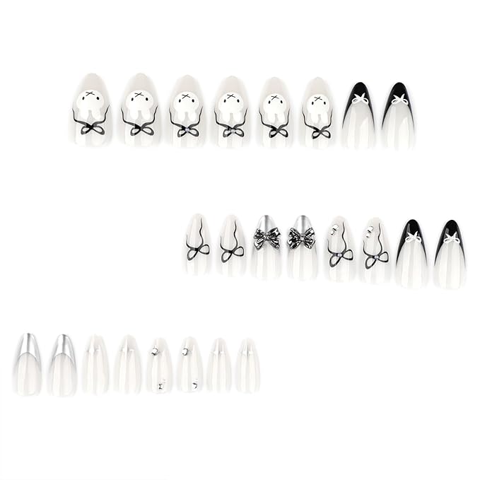 Cute Bunny Press On Nails almond,24pcs Medium False Nails with Black & White Bow Design, 3D Metallic Bow and Rhinestone Fake Nails, Cartoon Acrylic Stick On Nails Kit for Women Girls