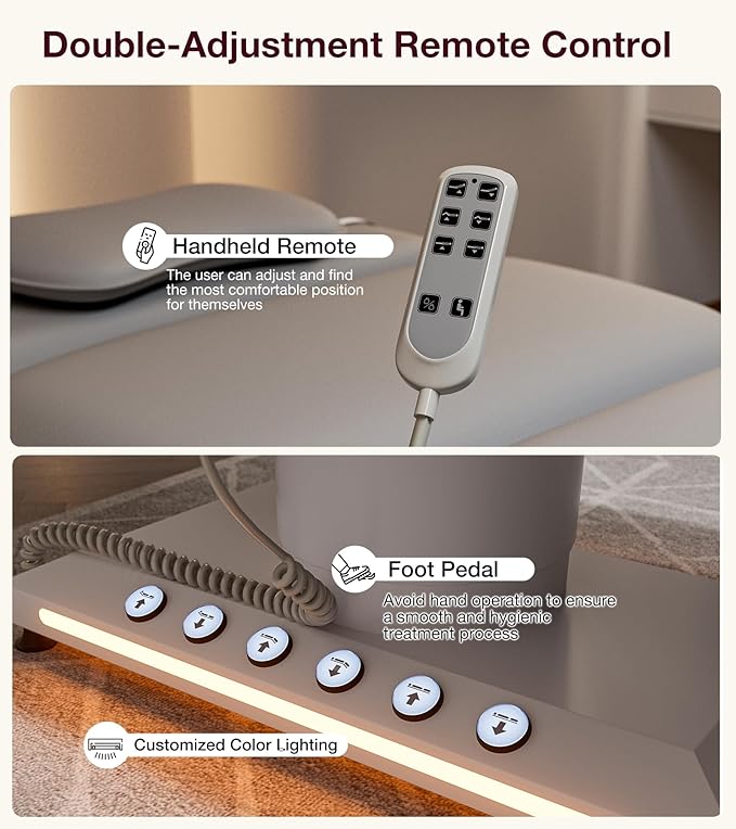 - Dual Remote Control: Comes with both a hand-held remote and a foot pedal, giving you flexible and intuitive control over all electric functions. Whether standing or seated, you can easily adjust the bed without interrupting your workflow, improving both efficiency and the client experience