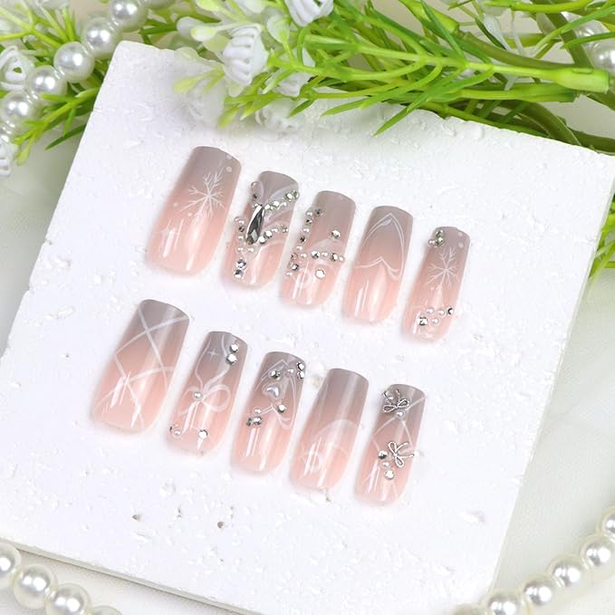 Winter Press on Nails Medium Square Fake Nails with Heart Bow Pearl Rhinestones Designs Gradient Nails Press ons for Women 24Pcs