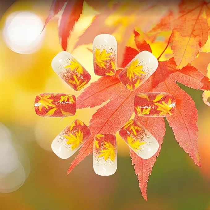 - Notice: The maple leaf fake nails will stay longer if you clean your nails before use, and avoid water within the first hour of wearing