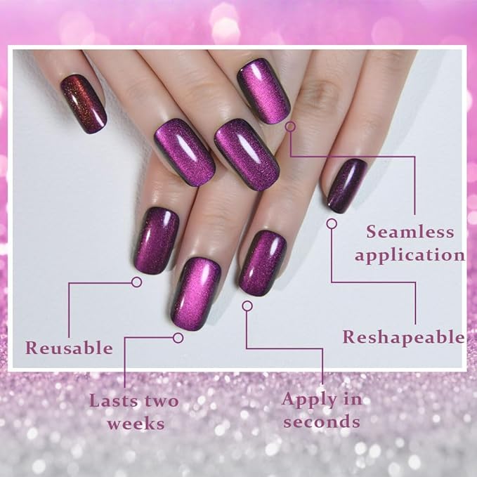 Purple Cat Eye Press on Nails Medium Square, Medium Square Glue on Fake Nails for Women Gift, Dark Purple Holographic Glitter Glossy Reusable Soft Gel Stick Press on Acrylic False Nail with Designs