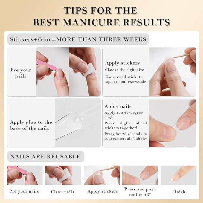 - Easy to Apply: Just clean your nails,then choose a suitable nail size,apply glue or jelly glue on your nails and press for a moment,you can have almond nails press ons in a few simple steps. Normal care will last a few days,with glue it will last longer
