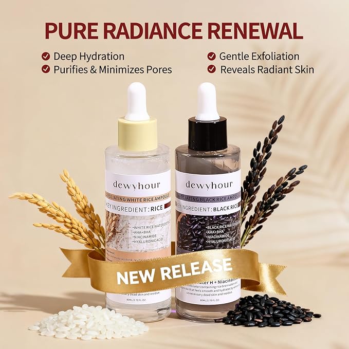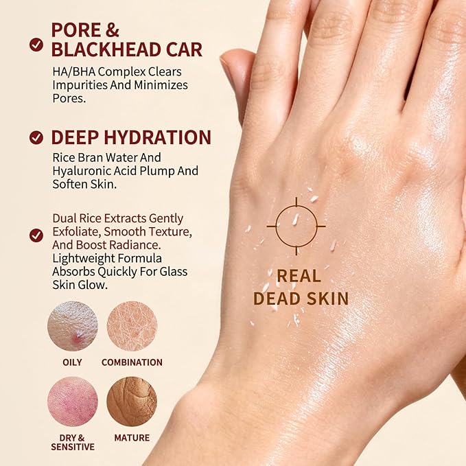 - BLACK & WHITE RICE DUAL EXFOLIATION: White rice water extract brightens and revitalizes skin while cleansing pores; black rice water extract gently exfoliates, helps unclog pores. Dual action effectively removes dead cells and impurities for glass-skin radiance.