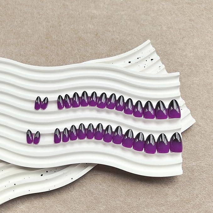 - Complete Ombre Nail Kit with Glue & Tabs: Each ombre french nail set includes 30 purple to black fake nails short almond in multiple sizes, strong nail glue, adhesive tabs, mini nail file, wooden cuticle stick, prep pads. Everything you need for instant short almond nails press ons just in one case