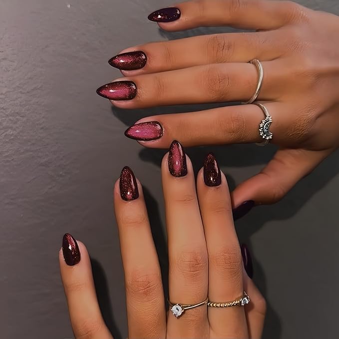 - Long-Lasting and Thick Sparkle Nails: The double-structured design is thicker at the fingertip for extra durability and prevents splitting, while thinner at the cuticle for a seamless and natural fit. The manual brush-on cat eye gel nails press ons almond adds a real gel shine, is polish-free, and never fades