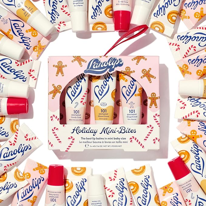 Lanolips Holiday Mini Bites Gift Set - Includes 101 Ointment Lanolin Lip Balm in Candy Cane, Glazed Donut & Gingerbread - Limited Edition Lanolin Holiday Gifts (3 Pieces)