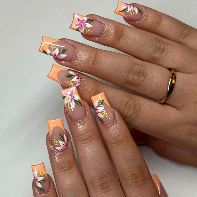 French Tip Press on Nails Medium Length Square Fake Nails with Flower Designs Orange Nails Press ons Fall False Nails for Women 24Pcs