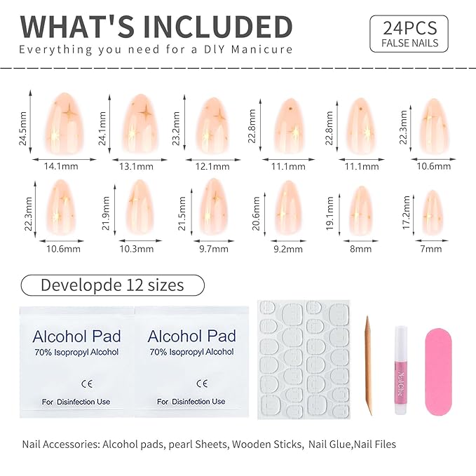 - Package Includes: 24 pcs stick on false glue on nails kit, each box includes 24 short press on nails, 1 sheet of 24 sticky nail pieces, 1 cuticle stick, 1 double sided nail file and gel press on nails cleaning pads, a small tube of nail glue,All the tools you need to apply the nails are included in one set