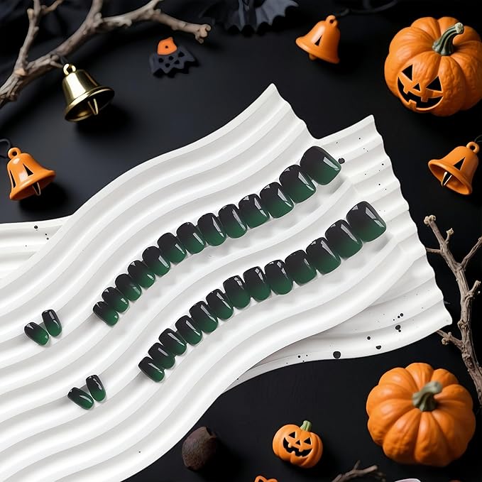 KQueenest Ombre French Press on Nails Short Square, Dark Green Black Fake Nails Short Coffin, Gradient Color Acrylic Nails Press Ons, Soft Gel Glue on Nails for Women Christmas in 30 Pcs