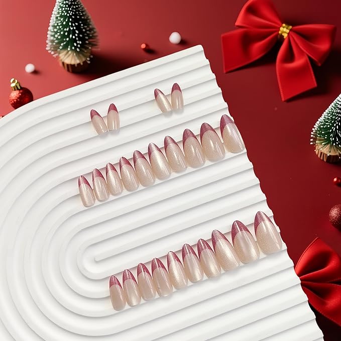 - Complete French Nail Kit with Glue & Tabs: Each glitter french tip nail set includes 24 bling red french tip fake nails short almond in multiple sizes, strong nail glue, adhesive tabs, mini nail file, wooden cuticle stick, prep pads. Everything you need for instant gel nails press ons just in one case