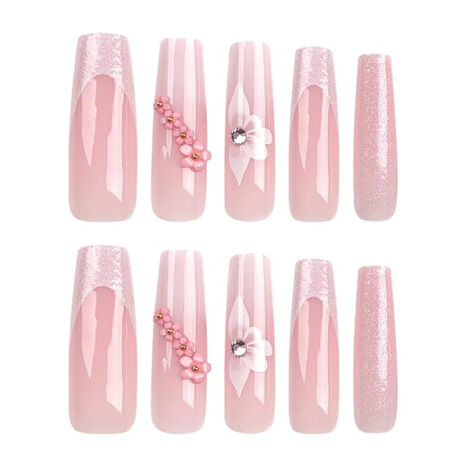 - Perfect for any occasion: These long square press-on nails feature an elegant white flower gradient French tip with sparkling rhinestones and glitter accents. Perfect for weddings, parties, or adding luxurious glamour to your everyday style