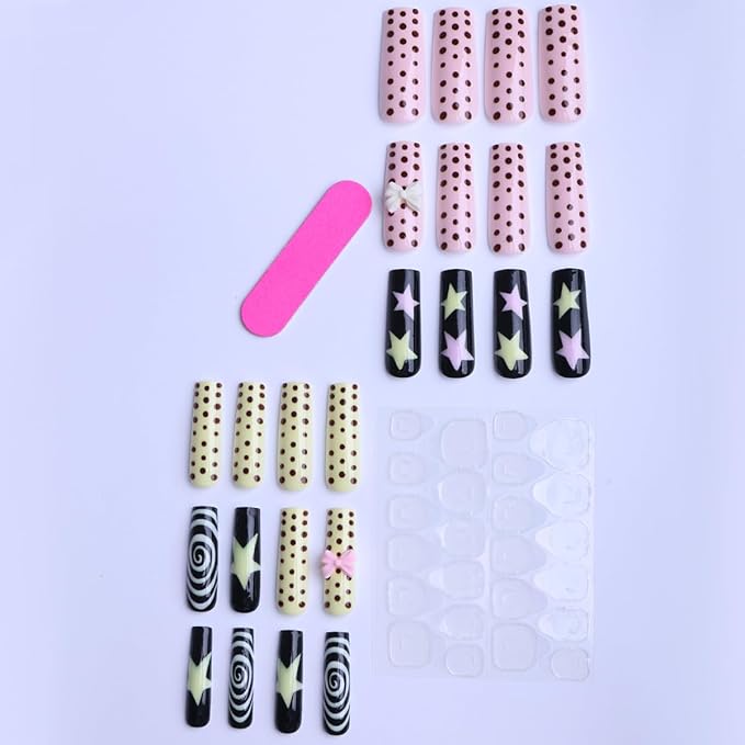 - Perfect for any occasion: These long square press on nails feature a playful polka dot pattern with elegant 3D bow, star, and twist designs. Perfect for parties, weddings, or adding a fun yet sophisticated touch to your everyday style