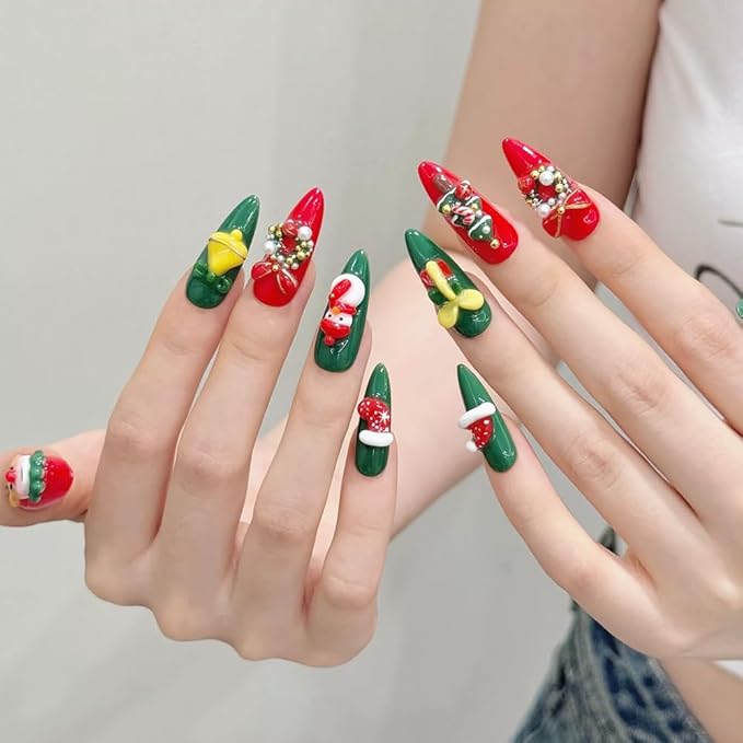Handmade Press on Nails Long Stiletto Fake Nails Christmas with 3D Snowman and Christmas tree Designs Red Glitter Cute Acrylic Nails for Women 10pcs (Size M)