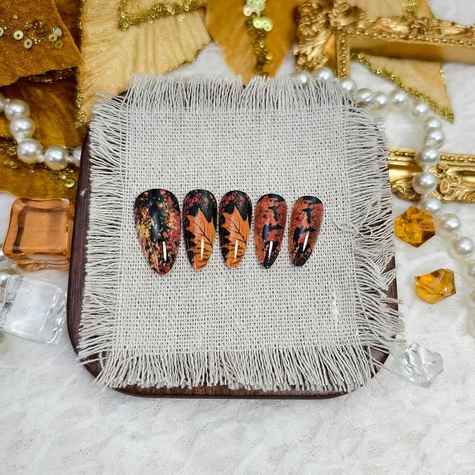 - Package: 24pcs fall press on nails almond shaped, 1pcs nail file, 24pcs jelly glue sticker, 1pcs wooden stick for removing false nails. Jelly glue is not as strong as liquid glue, but it makes autumn maple leaf press on nails reusable. Please use suitable glue according to different scenes