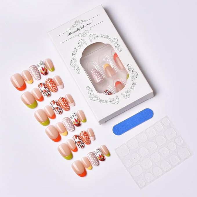 Thanksgiving Short Square Press on Nails Fall Theme Fake Nails Colorful Cartoon Polka Dot Stick on Nail