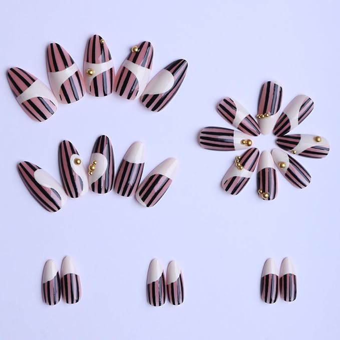 Long Almond Press on Nails Nude Pink and White Black Stripes Fake Nails with Gold Stick on Nail for Women 24pcs