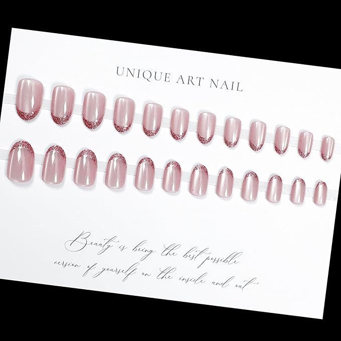 Short Almond Press on Nails French Tip Nude Pink Fake Nails Cat eye Glitter Stick on Nail for Women 24pcs