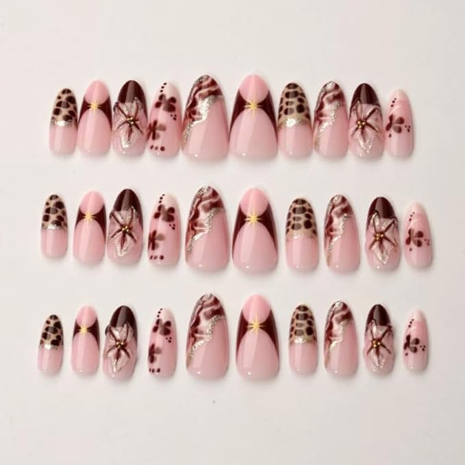 Long Almond Press on Nails Nude Pink Brown Fake Nails Leopard Print Luxury Artistic Nail Decorations Stick on Nail for Women 24pcs