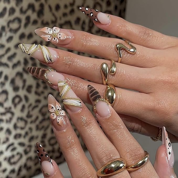 Long Almond Press on Nails Glossy Fake Nails Nude Leopard Print with Floral Gold Chain False Nail Stick on Nail for Women 24pcs
