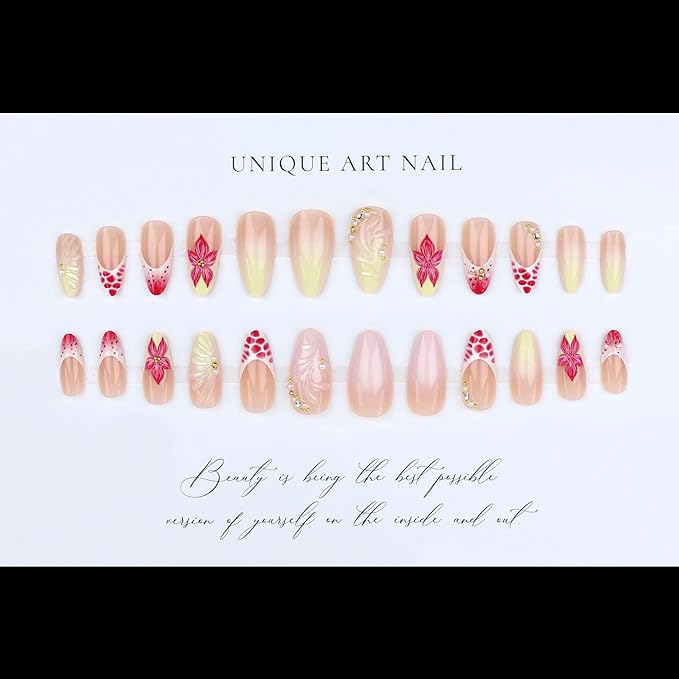 - How Natural & Comfortable : fake nails are designed according to the radian and thickness of female nails. The design of our press on nails fits the nail edge better, the effect is natural and comfortable, will not cause a great burden on the nail bed. Elaborate design making them both soft and flexible, and making them feel like real nails. Designed to fit the nail beds perfectly, render a gentle flex and a beautiful cuticle line
