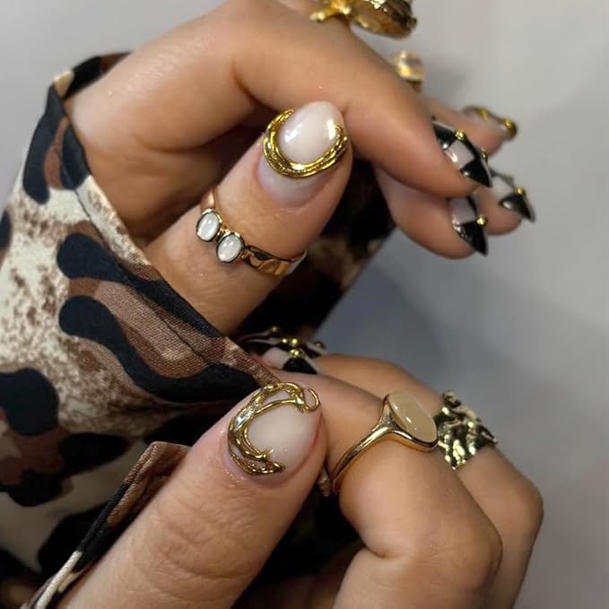 Short Square Almond Press on Nails Nude Gold Foil Fake Nails Stick on Nail for Women 24pcs