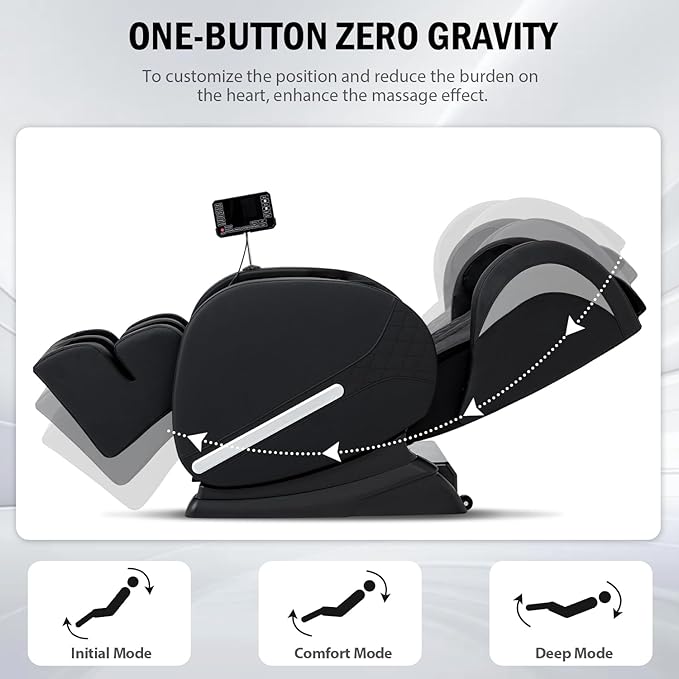 - 【Deep Zero Gravity】-There are 3 levels of zero gravity inclination angles in this massage chair. Press the zero-gravity button to adjust the optimally reclining position, make your heart and knees at the same level, put the center of gravity on the buttocks, reduces the pressure on the spine and joints which will effectively alleviate the pressure on the vertebrae, relieve the discomfort of back pain, make the entire body in a state of complete relaxation.