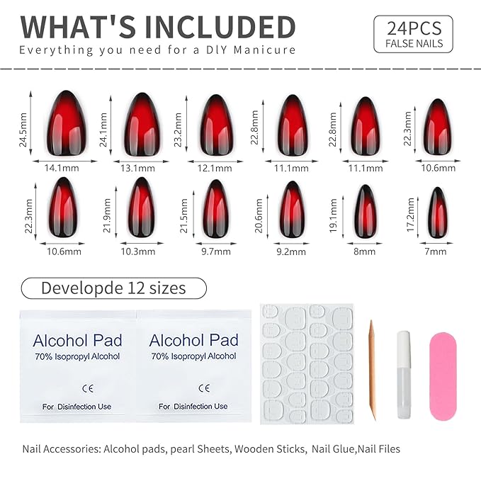 Medium Almond Press On Nails – Red and Black Gradient Glossy Acrylic Fake Nails, 24PCS Reusable Stick On Nails Kit with Glue & Tools for Women, Shiny Vampire Ombre Nails for Party & Everyday Wear