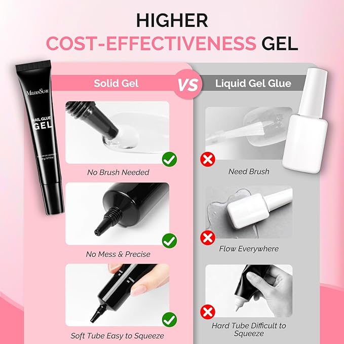 - Super Strong Adhesion, Lasting 28+ Days: MelodySusie’s Solid Nail Glue Gel for Nail Tips effectively fills gaps between any type of nail bed and nail tips, forming an airtight seal to prevent moisture and air from seeping in. But remember to apply nail tips at a 45-degree angle to expel air bubbles. With proper application, it can keep your nail art lasting for over four weeks.
