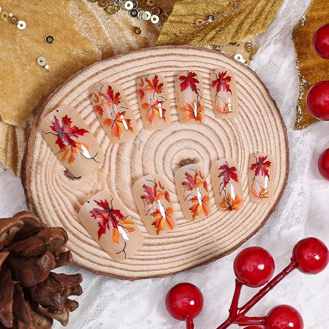 - Maple Leaf Nails Kit : 24PCS ,12 different sizes of maple leaf press on nails short square fake nails , 24 jelly glue, 1 nail file, 1 wooden stick.full range of tools meet all your fall nails decor supplies wearing needs. It can be worn repeatedly so that you can replace it at any time