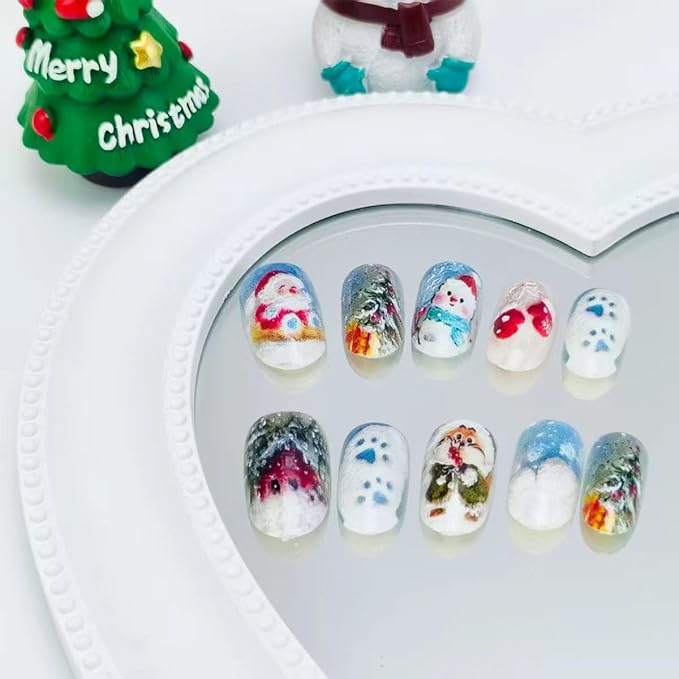 - DIY Christmas Nail Art: Cute press on nails short almond shape, combine Christmas Tree, snowflakes, snowman elements with classic color and glitter rhinestones , looks shiny and attractive, suitable for women DIY Christmas nails art