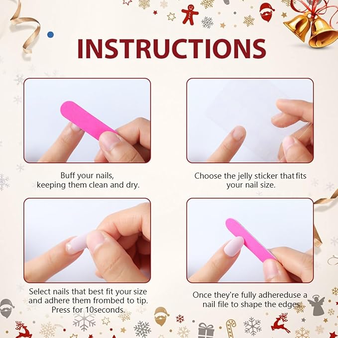 - Easy to Use: No need for a nail salon, just choose the appropriate size of false nails, use nails adhesive sticker to press them on your nails for a few minutes, and easily complete a beautiful Christmas nail art decorations