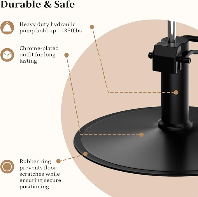 - 【Sturdy & Well Built】 The salon chair features graceful seam stitching, solid one-piece chair back and sides for ultimate support and ease. Heavy duty hydraulic pump with 330lbs weight capacity. Rubber ring around chrome base to protect floor from scratching. It’s strong and durable for hairdresser daily using.