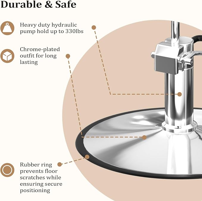 - 【Sturdy & Well Built】 The salon chair features graceful seam stitching, solid one-piece chair back and sides for ultimate support and ease. Heavy duty hydraulic pump with 330lbs weight capacity. Rubber ring around chrome base to protect floor from scratching. It’s strong and durable for hairdresser daily using.