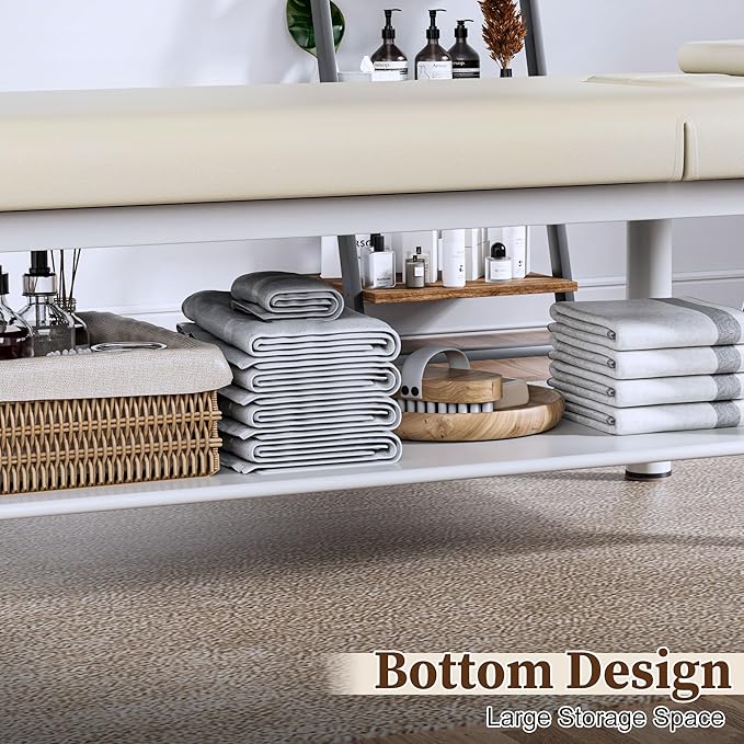 - Open-Chest Breathing Design & Large Storage Shelf :The unique open-chest design relieves upper-body pressure, promotes smoother breathing, and improves circulation during long massage, facial, or physical therapy treatments. The large under-table storage shelf provides convenient space for towels, oils, and tools—keeping your spa or clinic workspace clean and organized at all times