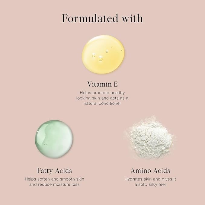 - Key Benefits: Vitamin E - helps promote healthy looking skin and acts as a natural conditioner Fatty acids- helps soften and smooth skin and reduce moisture loss Amino acids- hydrates skin and gives it a soft, silky feel Talc free