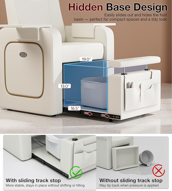 - Ideal for Small Spaces: Our pedicure chair features a pull-out base with an additional sliding track. This design ensures that the base moves along a precise path when pulled out. Even when the client presses their feet on the footrest, the chair will not shift or tip over, reducing the risk of spills. When not in use, the base can be pushed back and hidden, keeping your salon neat and organized. (Please note: the foot basin is not included.)