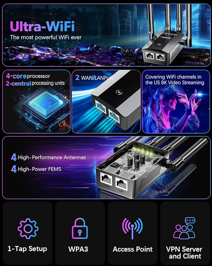 - COVER TO 13k+ SQ. FT, NO MORE DEAD ZONES! - Extends stable WiFi through floors and walls with 4 external antennas and advanced chips.Improves Coverage, Not Speed: Boosts signal reach, but may be slower than the main router due to shared bandwidth. Indoor Use: Best performance when installed indoors, as distance from the router affects functionality.The router is recommended to be within 20 feet.
