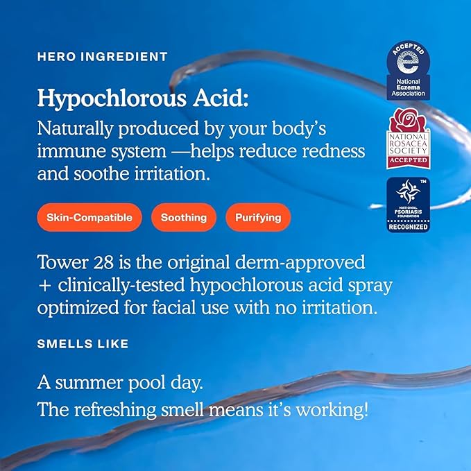 - The only hypochlorous acid spray recognized by all three leading U.S. skin health organizations—Eczema, Rosacea, and Psoriasis—it’s formulated specifically for facial use to deliver maximum results with minimal irritation. Think of it as a reset button for stressed-out skin, whether you're dealing with breakouts, post-workout sweat, or an eczema flare-up