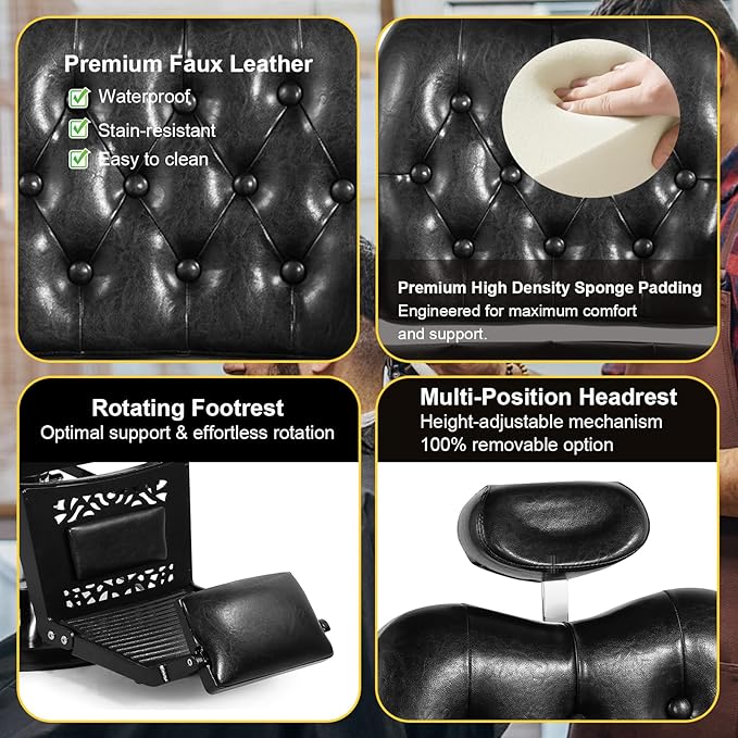 - 【Quality Materials】: The seat of the barber chairs for barbershop is covered with PVC artificial leather, which is skin-friendly and breathable, wear-resistant, and easy to clean. In addition, the seat is filled with high-density memory foam, soft and elastic. The galvanized surface is rust-resistant. It is also equipped with a steel footrest