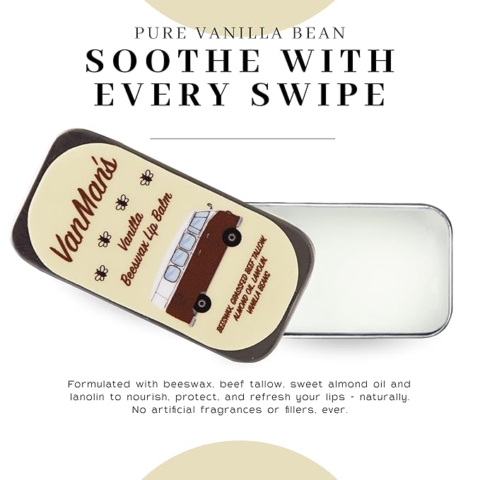 - WARM VANILLA COMFORT: Vanman's Beeswax Lip Balm is Infused with organic vanilla beans for a soft, calming scent and subtle sweetness. Adds a gentle warmth and soothing touch to every application.