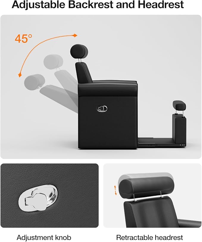 - Ergonomic Comfort Design: Features an adjustable reclining backrest, retractable headrest, and extendable footrest for maximum client comfort and technician convenience. Curved armrests and a wide, deep seat accommodate all body types with ease