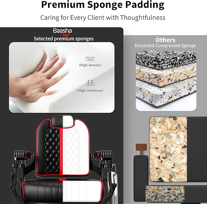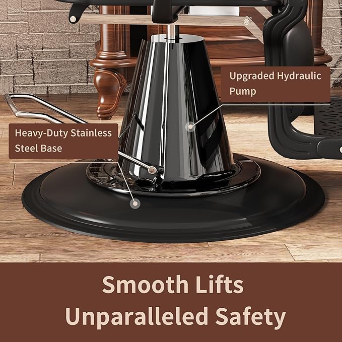 - Durable Materials: With an upgraded design, our Baasha barber chair features a black stainless steel frame, offering more durability than traditional wooden materials. Paired with a heavy-duty hydraulic pump and an oversized base, it ensures long-lasting use and safety.